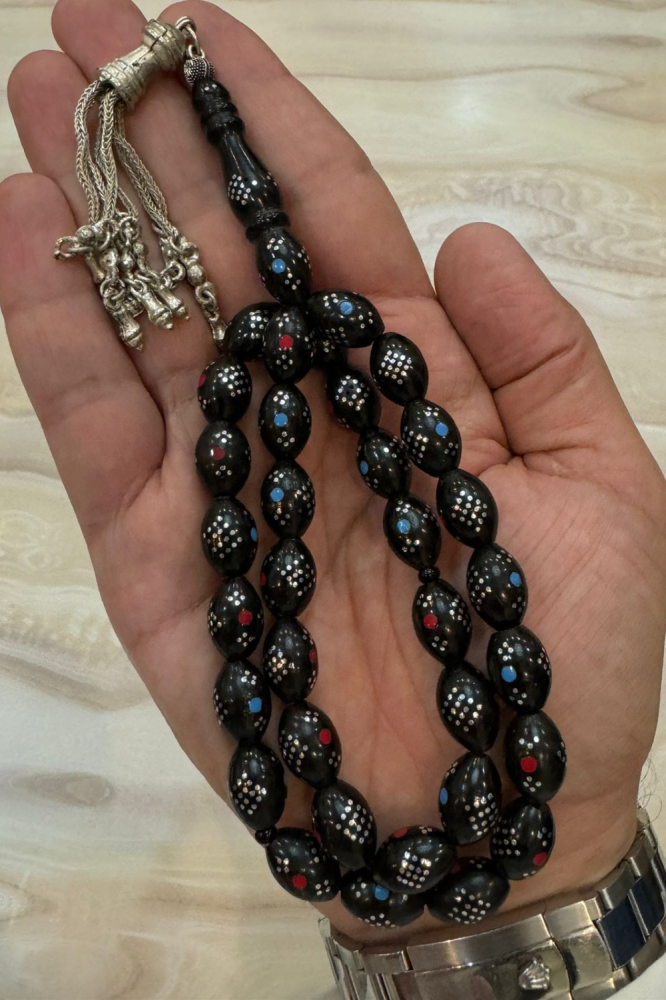 تُقدم لك هذه السبحة مزيجاً فريداً من الجمال و المظهر الأنيق ، فهي مصنوعة من خشب الكوك الأصلي المطعم بالفضة والأحجار الكريمة .